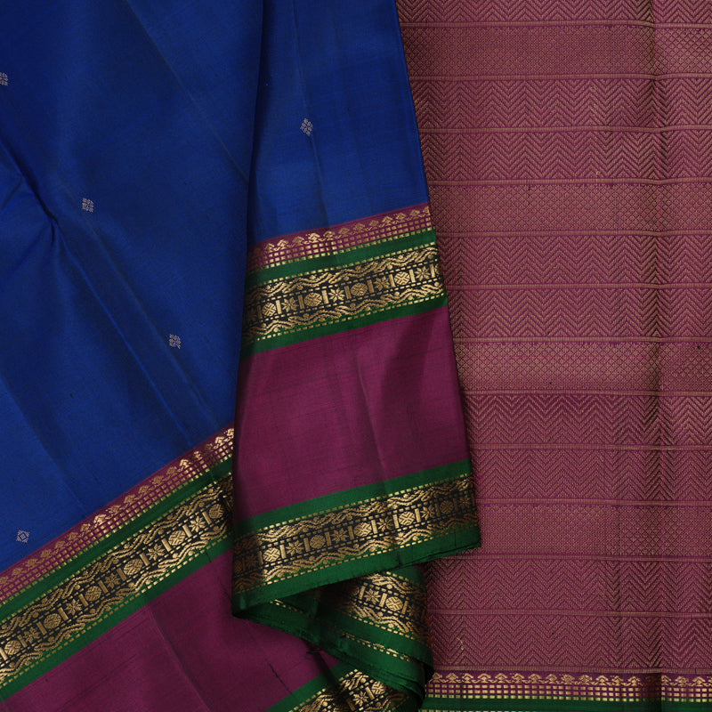 Experience the grandeur of a traditional Kanjivaram look in this remarkably soft drape with this Pure soft silk saree. The body features a rich royal blue color, offering a magnificent and regal foundation. The saree boasts a striking wine purple rettapet border (double border), which beautifully frames the drape and provides an intense contrast.