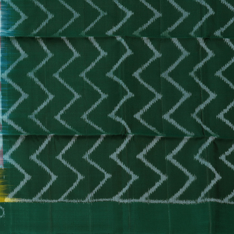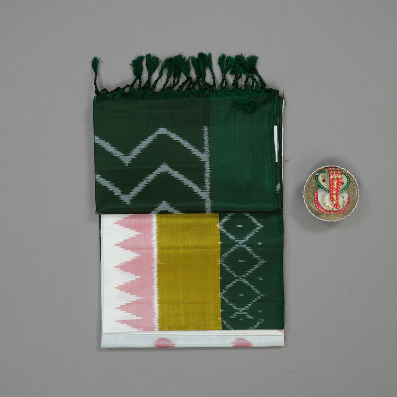 Exude timeless grace in this pristine white pure soft silk saree, featuring authentic Ikkat patterns. The deep bottle green contrast blouse and pallu provide a sharp, professional finish, making it perfect for formal office wear and high-profile meetings.
