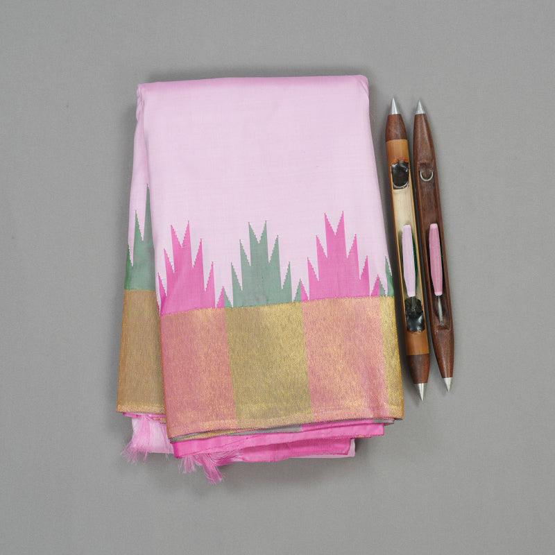 This Hayagrivas Handloom Baby Pink Kanjivaram Silk Saree with Gold Border is pure elegance. The delicate baby pink body is beautifully framed by a classic gold Korvai contrast border. The pink and green Temple Borders are a beautiful tribute to traditional design, adding a touch of divine grace to the drape.