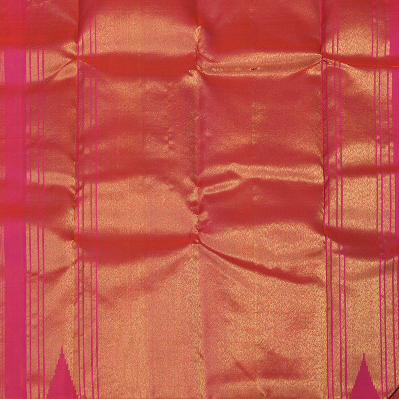 The pallu and blouse in matching reddish pink carry a subtle shimmer, enhanced with zari stripes and patterns that elevate the grandeur.