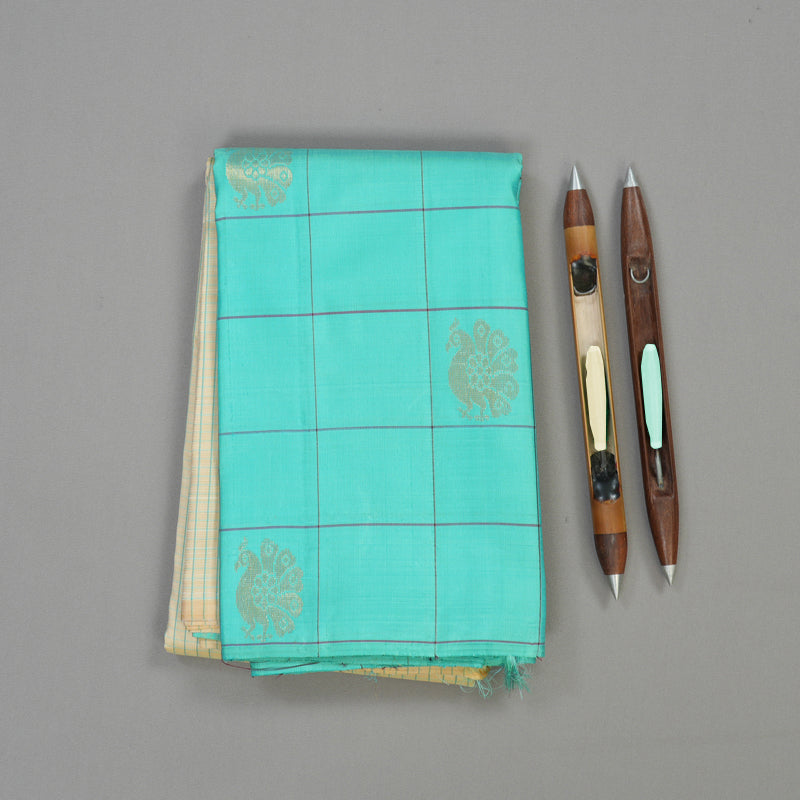 This elegant Kanjivaram silk beauty features a soft half-sandal upper body with vertical stripes in delicate tones, creating a subtle texture that feels both traditional and modern. The lower portion transitions seamlessly into a cool Sea Blue section filled with thin black checks and striking gold zari peacock motifs, lending it a youthful yet graceful appeal.