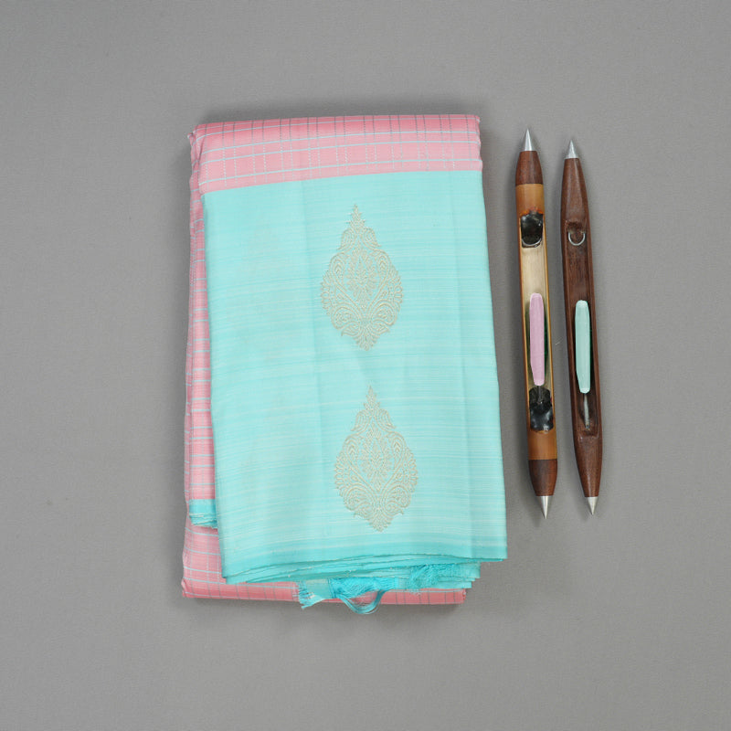 A soft, serene contrast defines this delicate Baby Pink Vintage Kanjivaram Silk Saree, framed by a gentle Powder Blue Border. This pure silk heirloom features subtle Thread Checks all over the body and graceful stylish paisley motifs on the border.