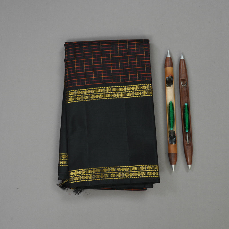 Embrace the deep texture of this elegant Black Vintage Kanjivaram Silk Saree. This traditional silk features all-over Thread Checks on the body, and the Rettapet border is finely woven with small rudraksham motifs, providing a subtle yet rich texture. This is an ideal pure silk saree for formal or traditional wear.
