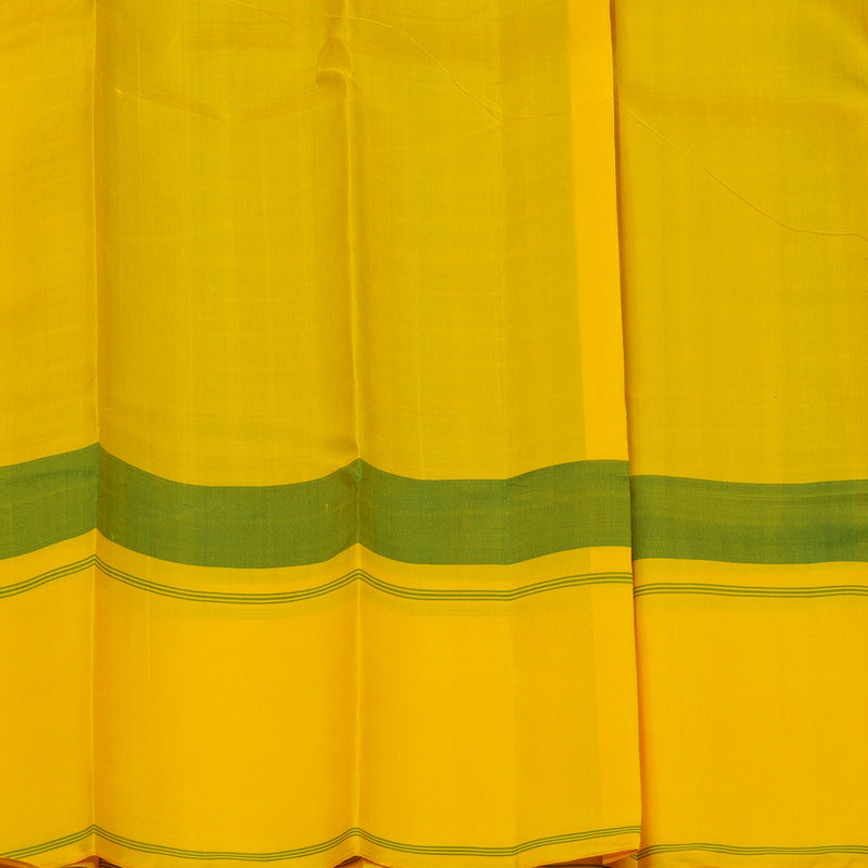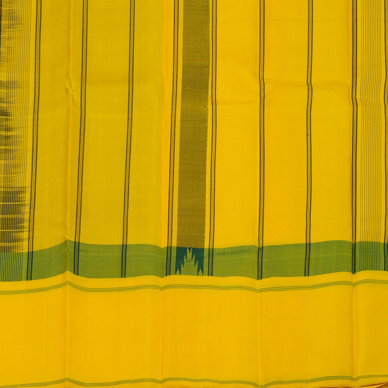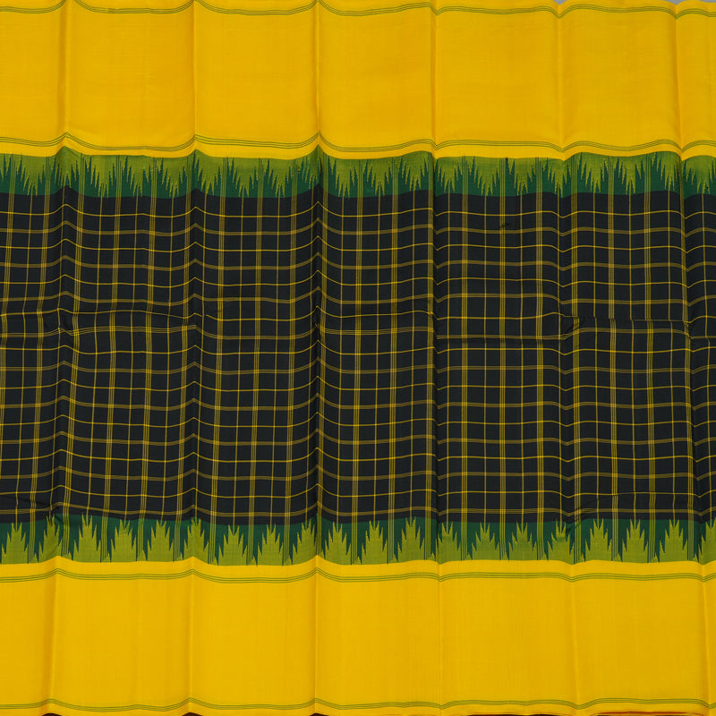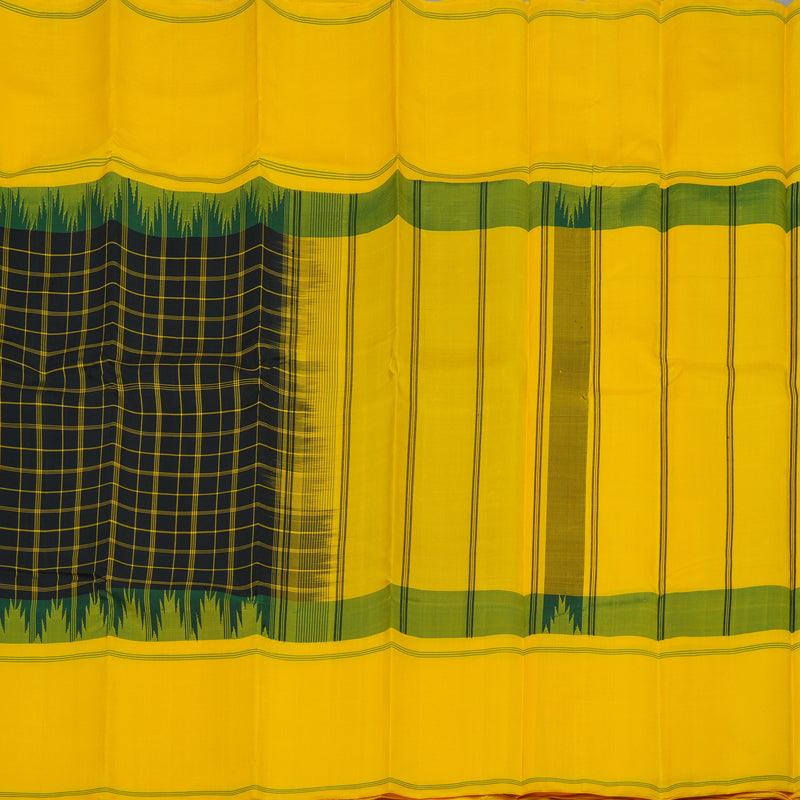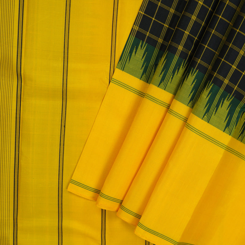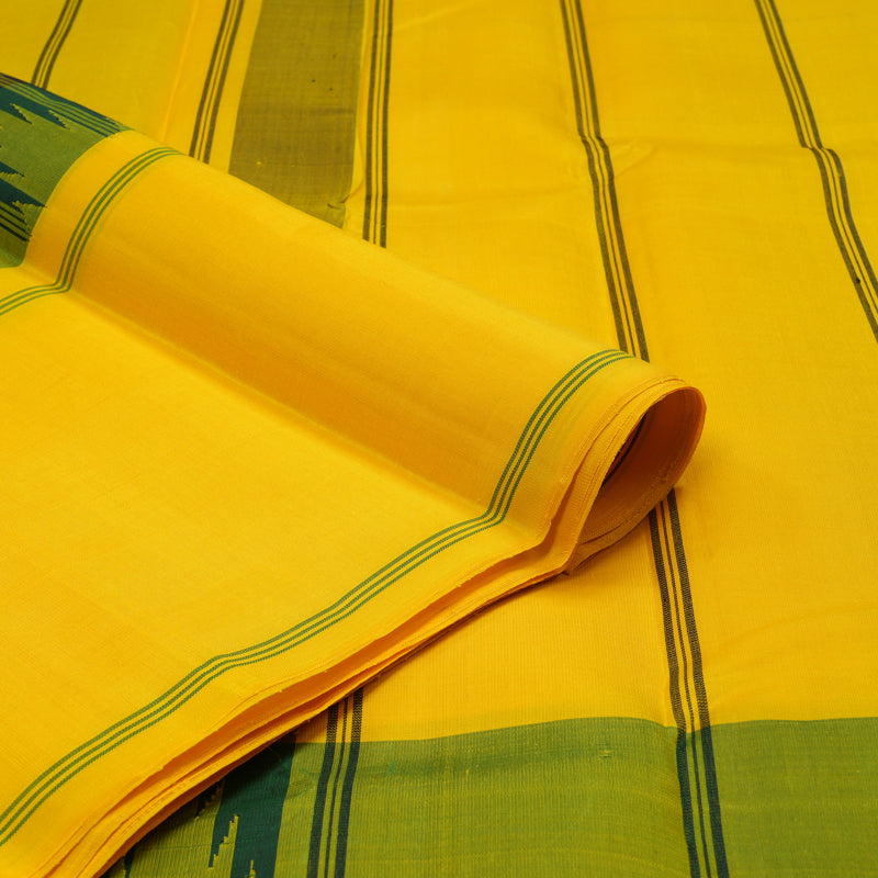 The saree is framed by a classic bodi karai border featuring heritage temple motifs, adding a timeless architectural touch. Completed with a vibrant yellow pallu and matching blouse, this striking masterpiece is priced at Rs. 16,650