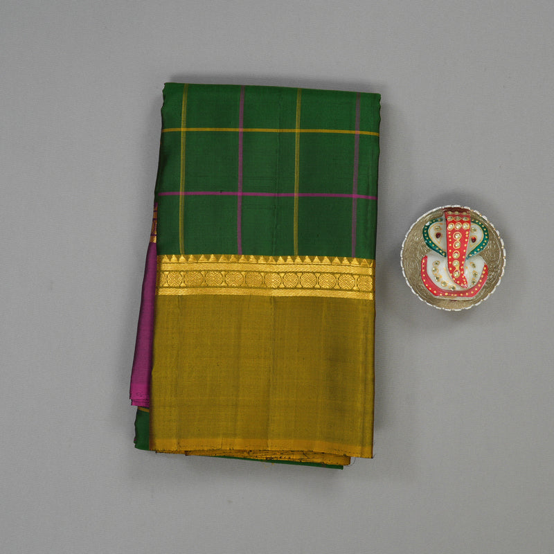 Redefine understated elegance with this bottle green Handloom Kanjivaram, featuring a body detailed with delicate thread checks for a textured, matte-finish appeal. This unique piece features the iconic Ganga Jamuna border, showcasing two different contrasting colors on either side, adding a dynamic and artistic edge to the traditional drape.