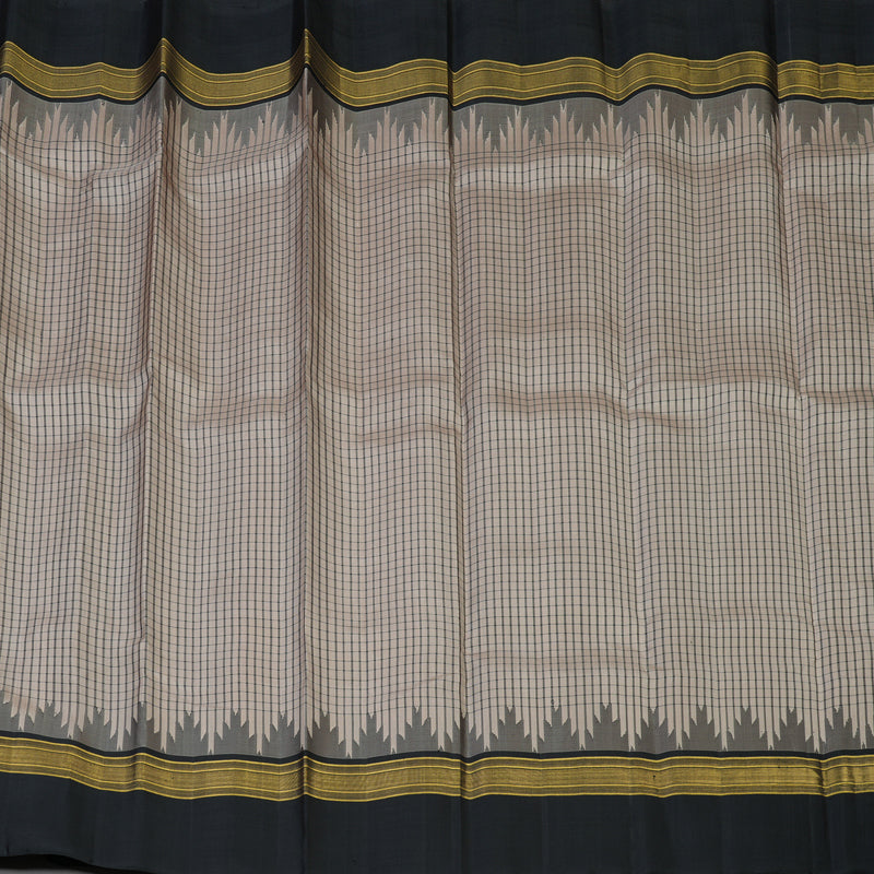 This sophisticated Handloom Kanjivaram Silk saree features a serene cream body accented with refined thread checks. It is defined by a traditional kaal erangina border with intricate temple weaving, creating a graceful architectural silhouette.