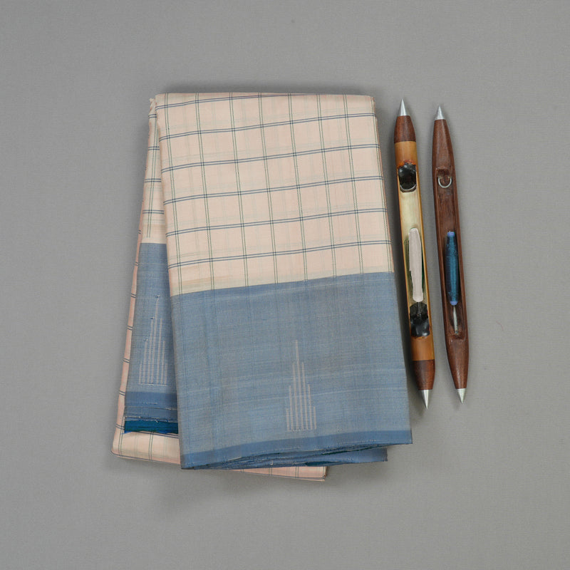 Discover the subtle, refined contrast of this Cream Vintage Kanjivaram Silk Saree, framed by a sophisticated Bluish Grey Border. The body is elegantly textured with all-over Thread Checks, which create a beautiful, luminous shimmer.