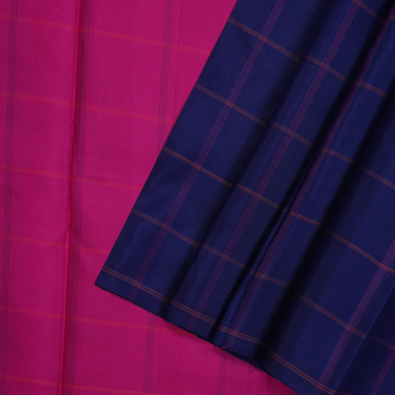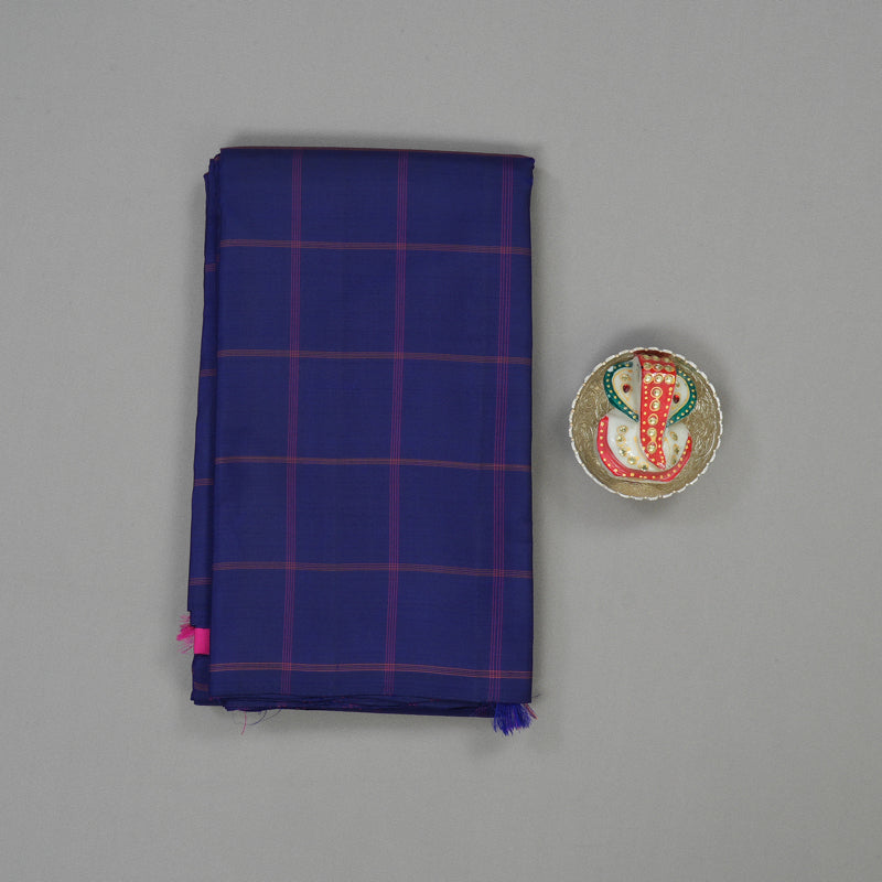 Embrace a sleek, contemporary look with this dark blue Handloom Kanjivaram silk saree, featuring subtle and elegant thread checks. This modern borderless design offers a clean silhouette, focusing on the rich texture and deep hues of the hand-woven fabric.