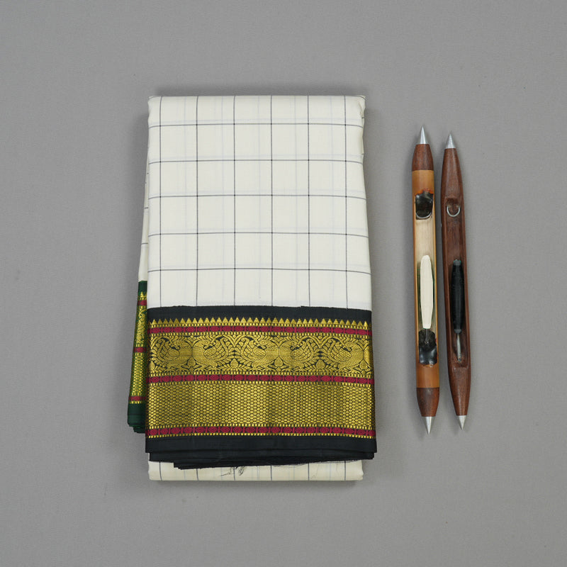 A soft, striking dual-tone contrast defines this serene Half White Korvai Contrast Kanjivaram Silk Saree, featuring a Ganga Jamuna border in Black & Green. This pure silk features the border woven with small buttas and Thread Checks all over the body.