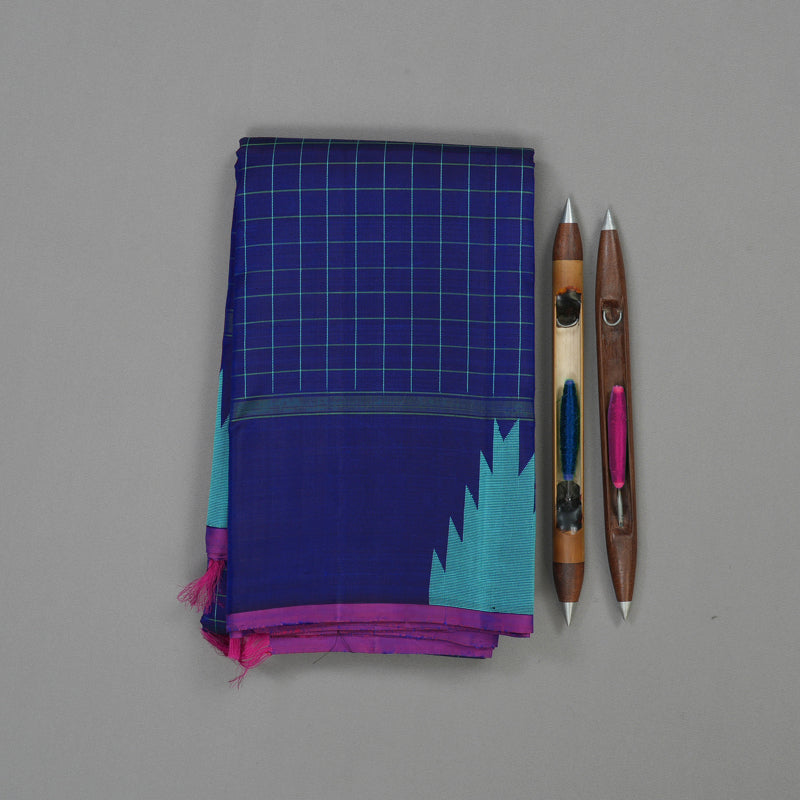 Embrace the deep elegance of this Royal Blue Vintage Kanjivaram Silk Saree. This traditional silk features all-over Thread Checks on the body, beautifully finished with a classic Temple Border. This combination provides a rich, woven texture and traditional iconography, making it an ideal pure silk saree for formal events.