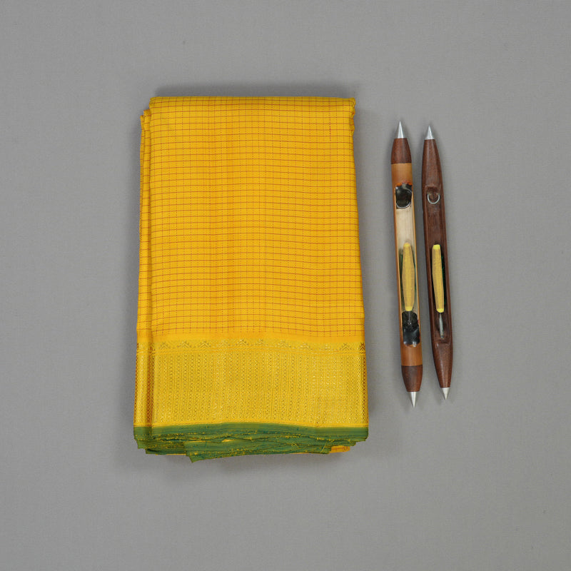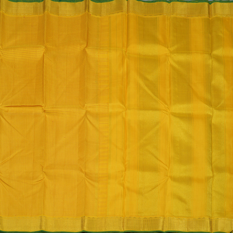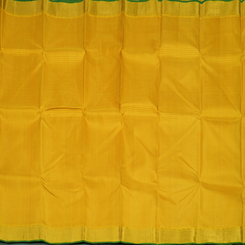 Exude cheer and elegance in this vibrant yellow Handloom Kanjivaram silk saree, featuring subtle and sophisticated thread checks throughout the body. This monotoned silk saree is elegantly framed by a crisp green selvedge, providing a delicate touch of contrast to the sun-drenched hue.