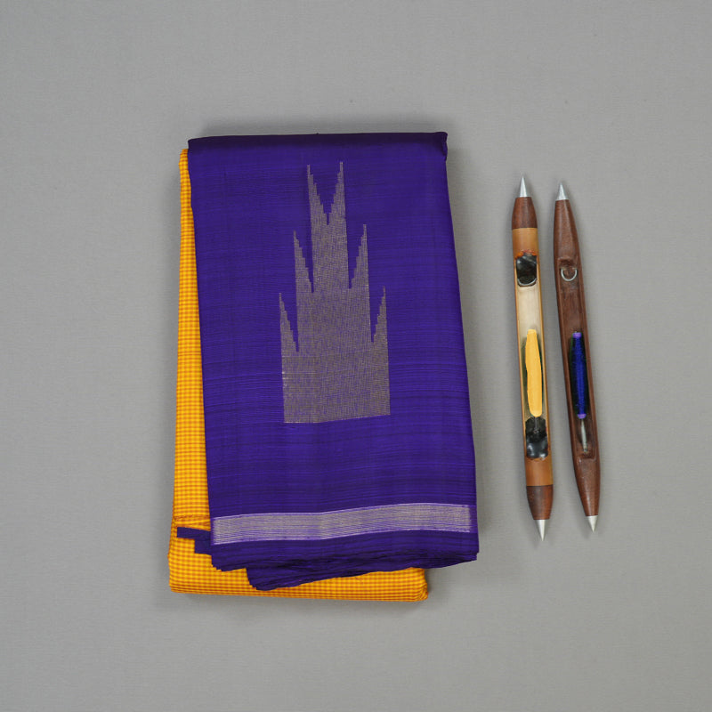 A subtle and elegant contrast defines this Yellow Muted Checks Bridal Vintage Kanjivaram Silk Saree, framed by a rich Purplish-Blue Border. This premium bridal silk features delicate Thread Checks on the body and a classic Temple Border. This is an ideal pure silk saree for sophisticated, traditional events.