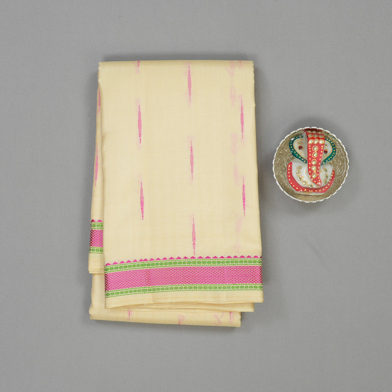 Embrace the delicate contrast of this Beige Thread Work Silk Saree, framed by a classic Pink Border. The soft body features subtle buttas, and the small zari pet border adds a gentle shimmer, allowing the handloom weaving texture to shine.