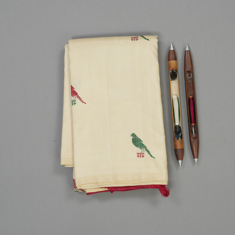 Embrace a minimalist aesthetic with this elegant cream Handloom Kanjivaram silk saree, featuring charming parrot thread work delicately woven across the body. This unique borderless design offers a contemporary, fluid silhouette, making it a standout thread work silk saree for those who prefer subtle sophistication.