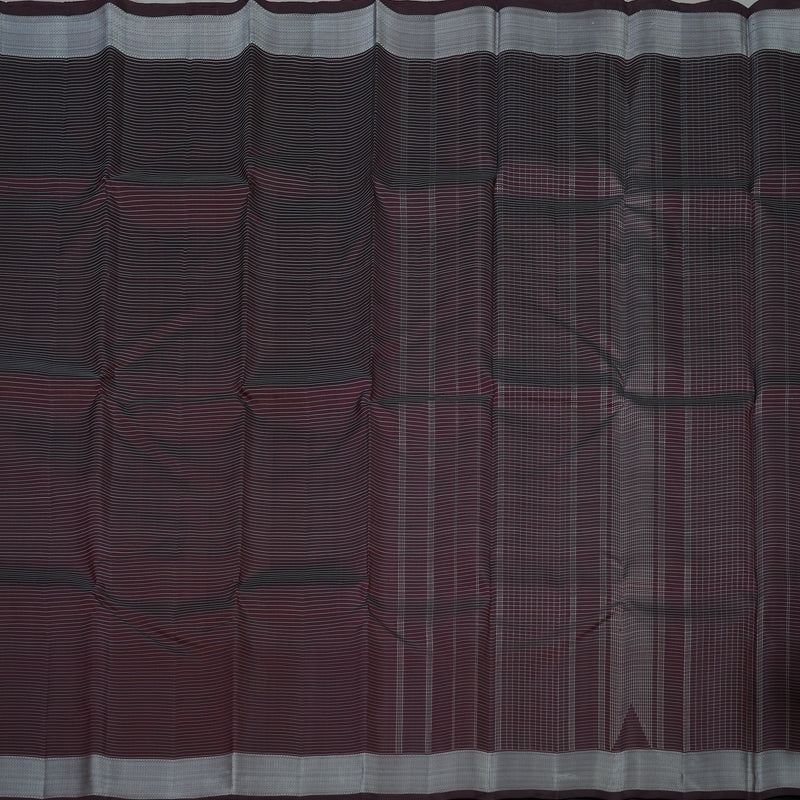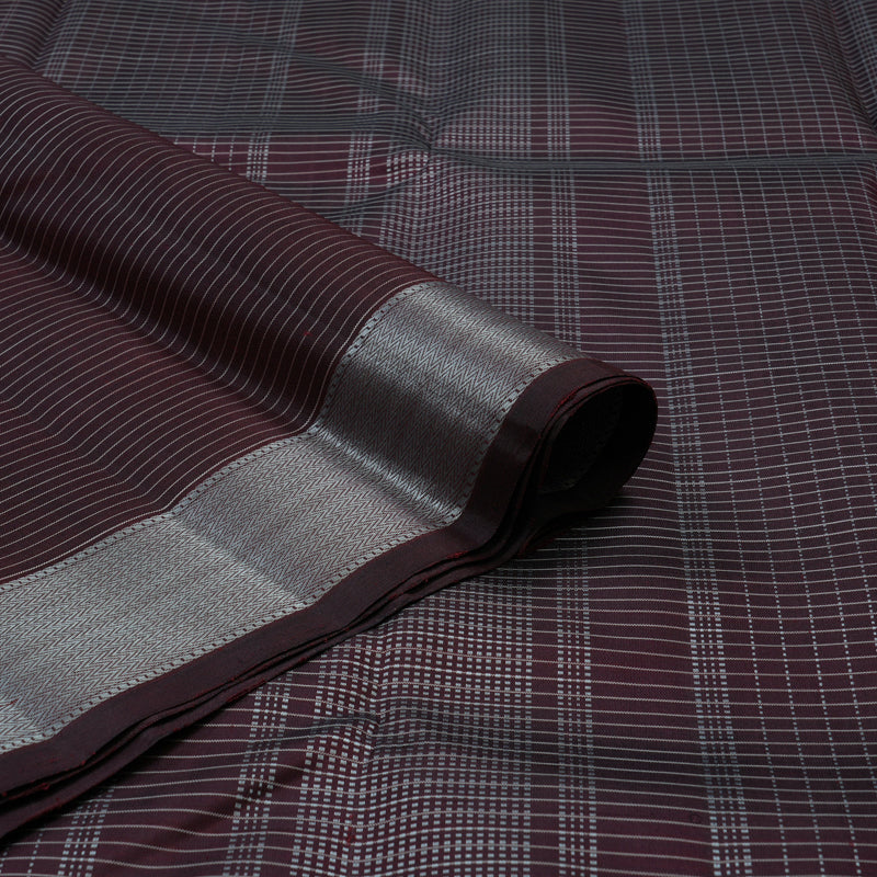 Exude effortless sophistication in this unique deep plum Handloom Kanjivaram silk saree. The body is subtly detailed with fine thread lines, adding a modern texture to the traditional weave. This contemporary aesthetic is carried into the border, which features distinct zigzag thread lines for a sharp, stylish finish.