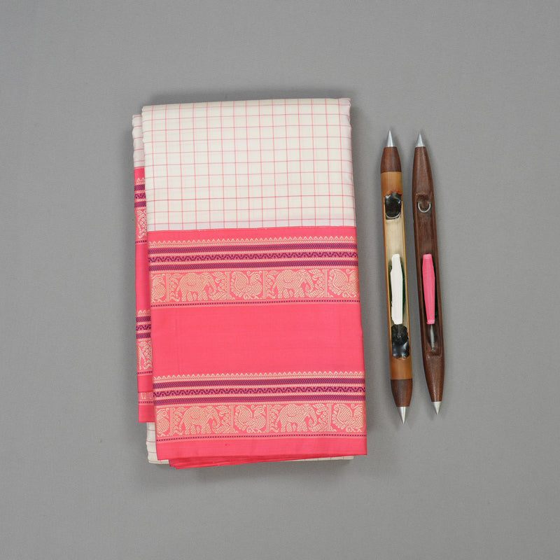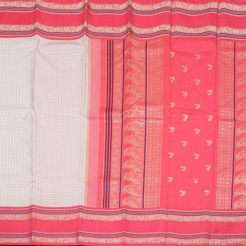 Embrace timeless purity in this elegant half-white Handloom Kanjivaram silk saree, featuring subtle and sophisticated thread checks across the body. This exquisite thread-work silk saree is crafted with a traditional korvai contrast, joining the ivory body to a magnificent rettapet border detailed with annapakshi and elephant motifs.
