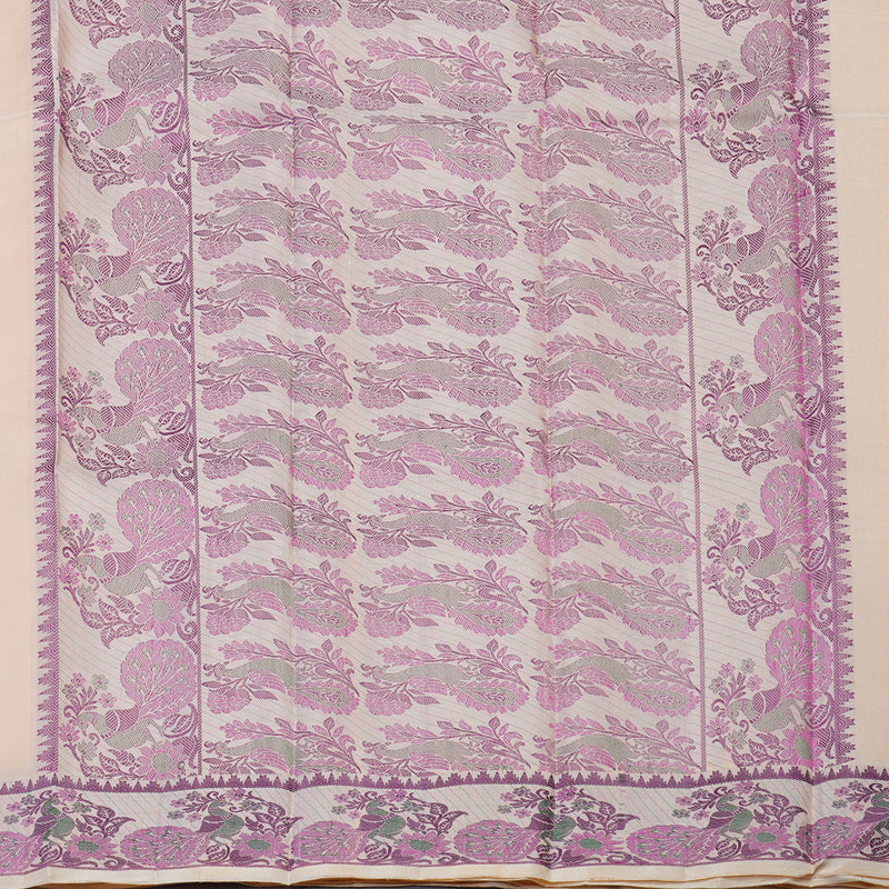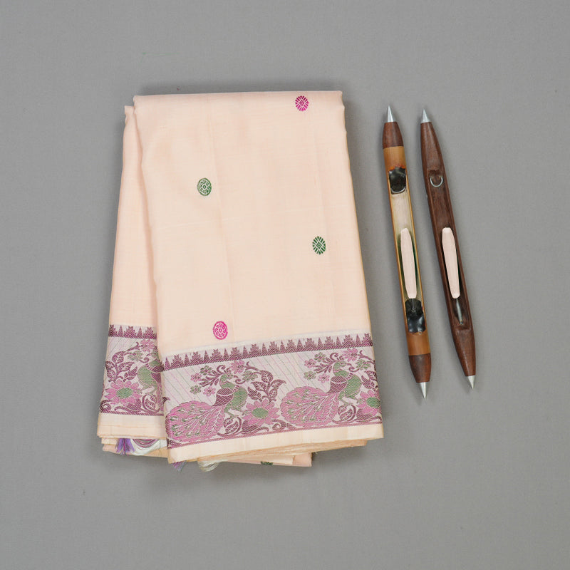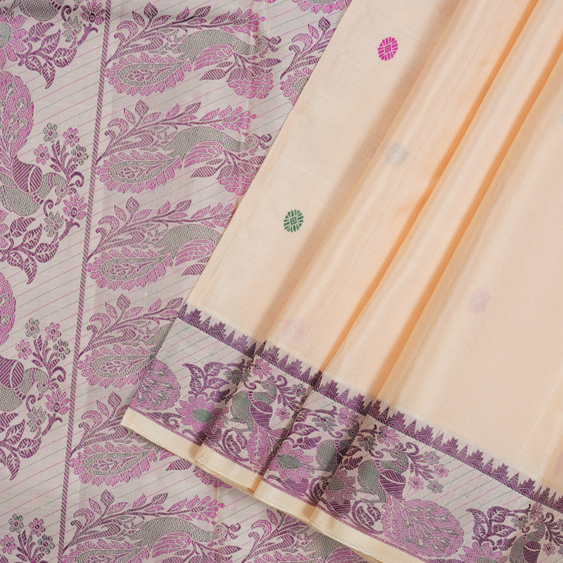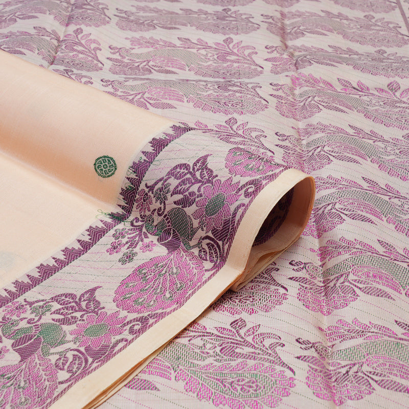 A soft, tonal look defines this elegant Mild Peach Orange Kanjivaram Silk Saree, framed by a matching Mild Peach Orange Border. This pure silk features peacock motifs on the border in Thread Work.