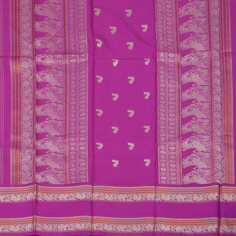 A soft, striking contrast defines this serene Milk White Kanjivaram Silk Saree, framed by a deep Purple Border. This pure silk features Thread Work checks on the body and commanding elephant and annapakshi motifs on the border.
