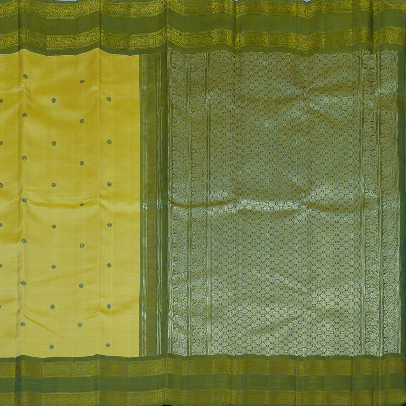 This Handloom Threadwork Kanjivaram features a refreshing pista green body adorned with delicate, intricate thread buttas. The saree is defined by a classic rettapet border, providing a structured and dignified frame.