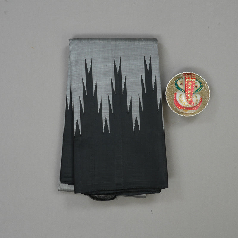 Embrace sophisticated contrast with this Hayagrivas Handloom Silver Grey Kanjivaram Silk Saree featuring a deep Black Border. This elegant Kanjivaram Silk Saree utilizes intricate Thread Work Temple Border weaving, where the traditional geometric Temple Border pattern is meticulously rendered using threads. The serene silver grey body is beautifully complemented by the dramatic black border. This is an ideal piece for those searching for silver grey black Kanjivaram or Thread Work Temple Border silk saree.