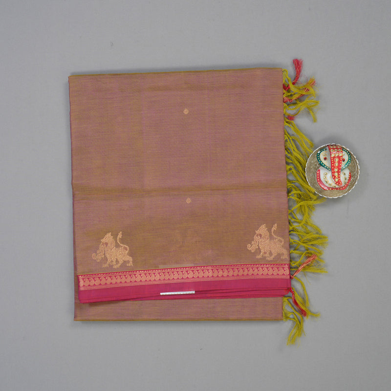 This exquisite dual-toned olive green and pink Pure Kanchi Silk Cotton saree offers a unique, shimmering aesthetic. The body is uniquely detailed with majestic horse motifs along the bottom, elegantly framed by a contrasting pink small border and a matching rich pallu and blouse for a sophisticated finish.