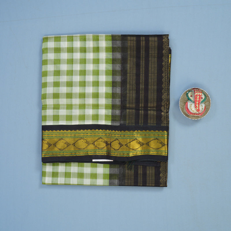 This elegant pure silk cotton saree features a refreshing half-white and light green checked body, offering a clean and traditional handloom aesthetic. The look is strikingly defined by a bold black pallu and blouse, creating a sophisticated and modern contrast for Rs. 7,330.