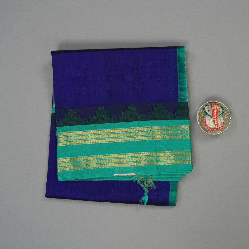 This richly detailed Silk Cotton Saree is valued for its unusual color combination and the complex combination of fish and temple motifs on the border. This elegant Ink Blue Saree is priced at ₹7,250, reflecting the quality of its motif work and comfortable weave.