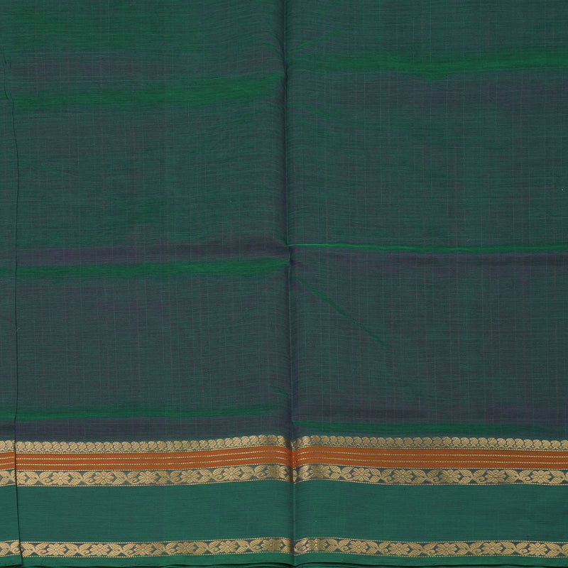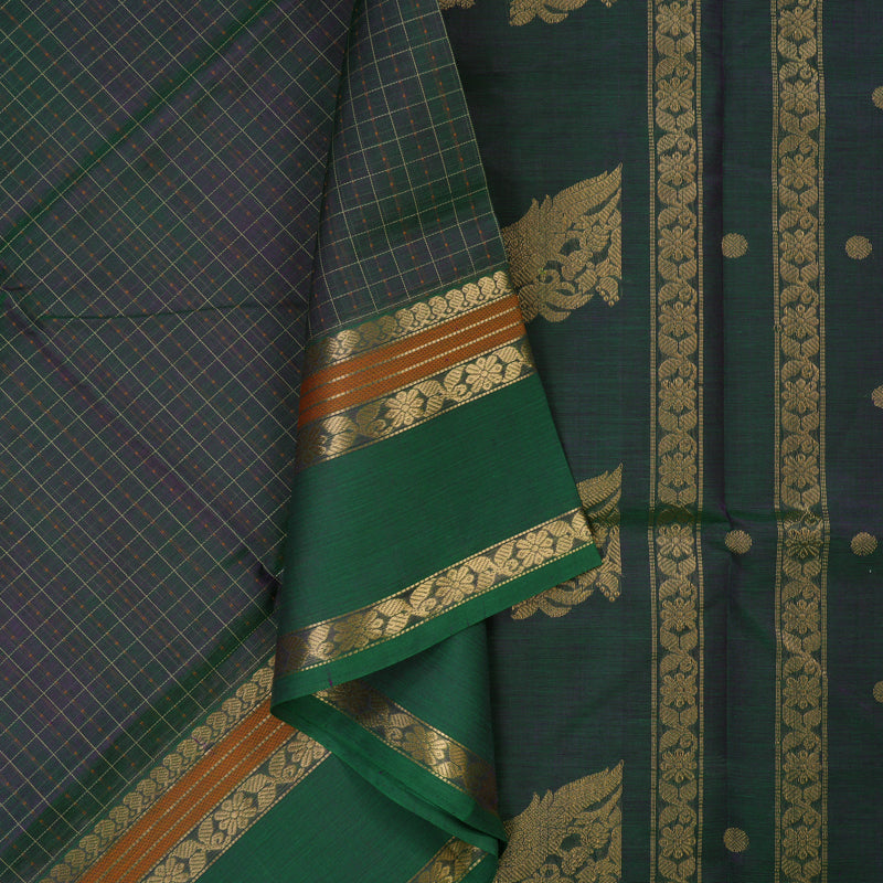 This exquisite Pure Kanchi Silk Cotton saree comes in a stunning mayilkazhuthu shade, featuring delicate thread checks and buttas. It is elevated by a traditional Rettapet border and finished with a matching pallu and blouse for a seamless, elegant look.