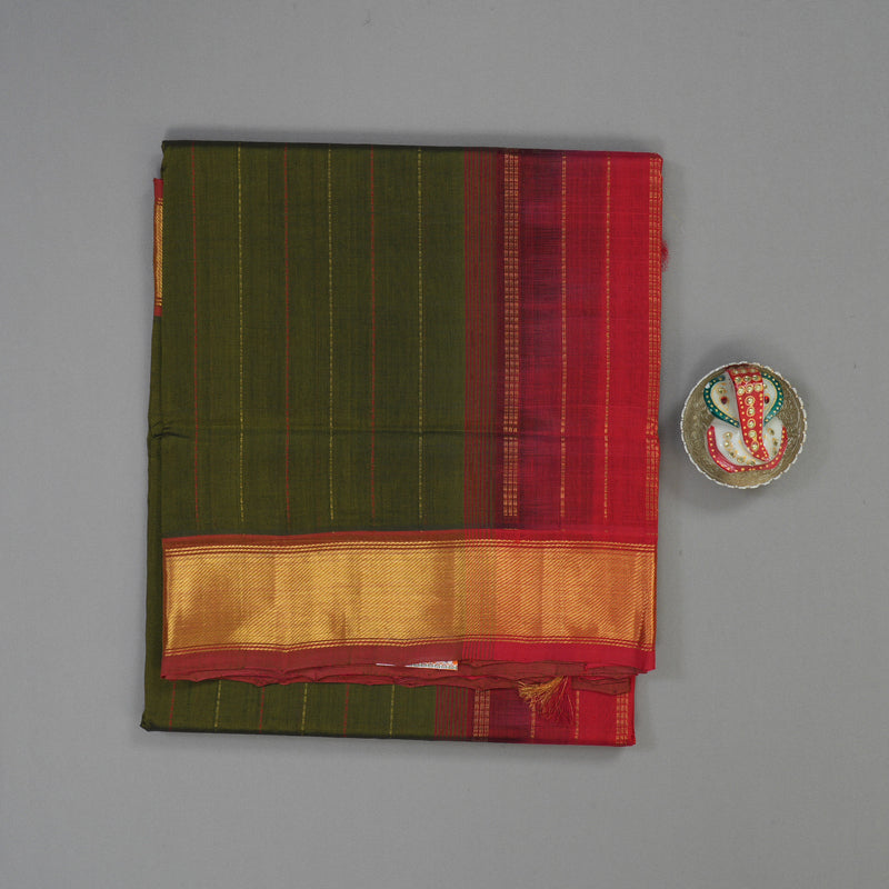 This elegant Pure Korvai Silk Cotton saree features a unique mehandi green body detailed with sophisticated vertical jari and thread lines. The earthy tone is strikingly contrasted by a vibrant red pallu and blouse, creating a classic and festive look.