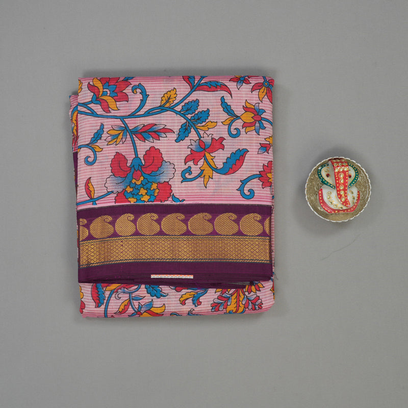 This charming pink Pure Printed Silk Cotton saree features a stylish body with stripes and floral patterns, blending contemporary lines with traditional botanical beauty. The look is enhanced by a classic korvai contrast and a deep violet pallu and blouse, creating a sophisticated and vibrant color palette perfect for any elegant gathering, priced at Rs.7090.