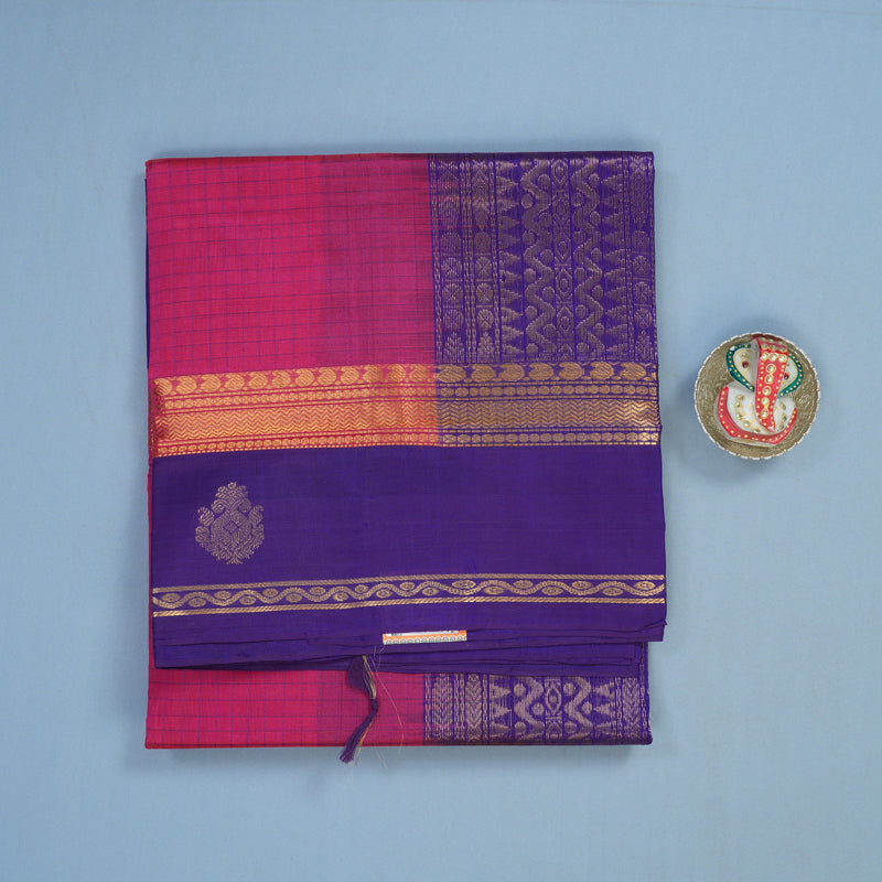 This charming pure silk cotton saree features a vibrant pink body detailed with delicate thread checks for a classic handloom texture. The look is elegantly completed with a contrasting purple pallu and blouse, creating a sophisticated and feminine colour palette for Rs. 8,040.