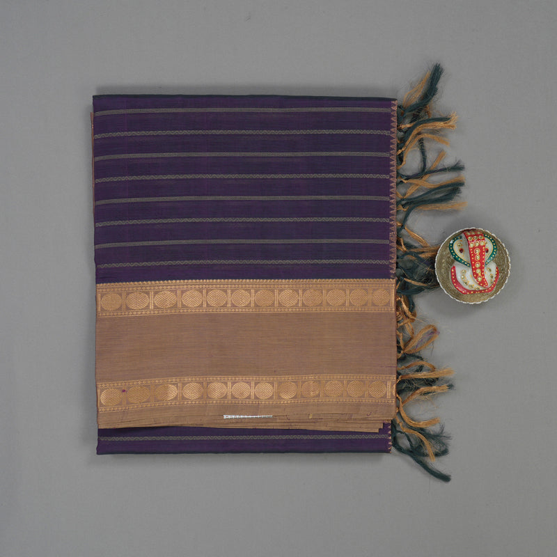 This elegant Pure Kanchi Silk Cotton saree features a rich purple body adorned with traditional veldhari lines. It is framed by a classic Rettapet rudraksham contrast border, offering a sophisticated texture and heritage appeal.