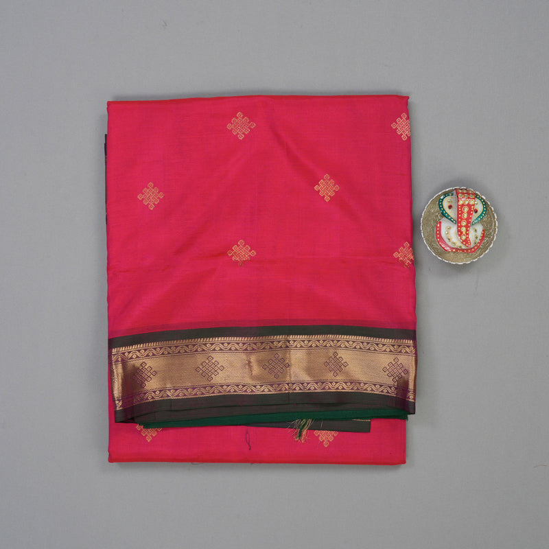 This vibrant rani pink Pure Kanchi Silk Cotton saree features a graceful body adorned with traditional kolam motifs, symbolising auspiciousness and heritage. The striking pink is beautifully offset by a contrast bottle green rich pallu and blouse, creating a timeless and regal colour combination.