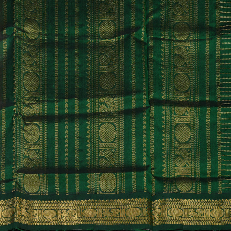 This striking Pure Korvai Silk Cotton saree features a vibrant rani pink body accented with traditional jari checks and an elegant Annam Chakaram border. Perfectly paired with a contrasting bottle green pallu and blouse, this handcrafted piece is priced at ₹7,560.