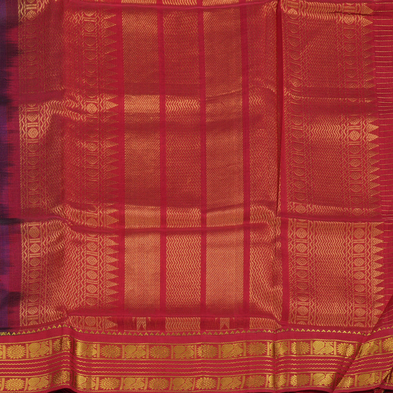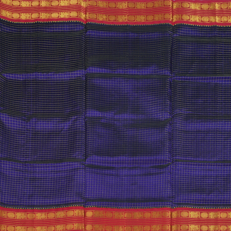 This striking pure silk cotton saree features a majestic royal blue body adorned with traditional jari checks for a touch of shimmer. The look is boldly completed with a vibrant red pallu and blouse, creating a classic and regal colour contrast for Rs. 7,250.