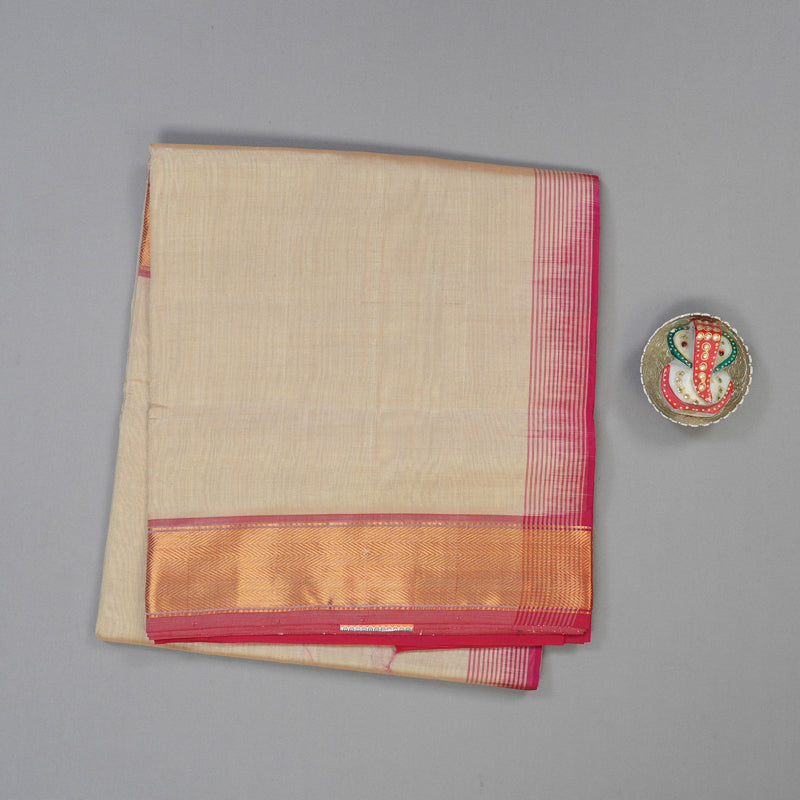 This graceful sandal beige Pure Silk Cotton saree offers a serene and polished aesthetic, blending a luxurious silk-like look with the breathable cotton-like comfort of a high-quality weave. The neutral body is beautifully brightened by a vibrant pink pallu and blouse, creating a soft and feminine contrast.