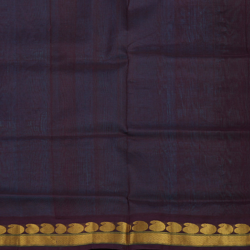 This chic pure silk cotton saree features a modern sky blue and lilac striped body that offers a refreshing, textured aesthetic. It is strikingly grounded by a contrast kanchana brown pallu and blouse, creating a sophisticated and unique handloom look for Rs. 6,540.