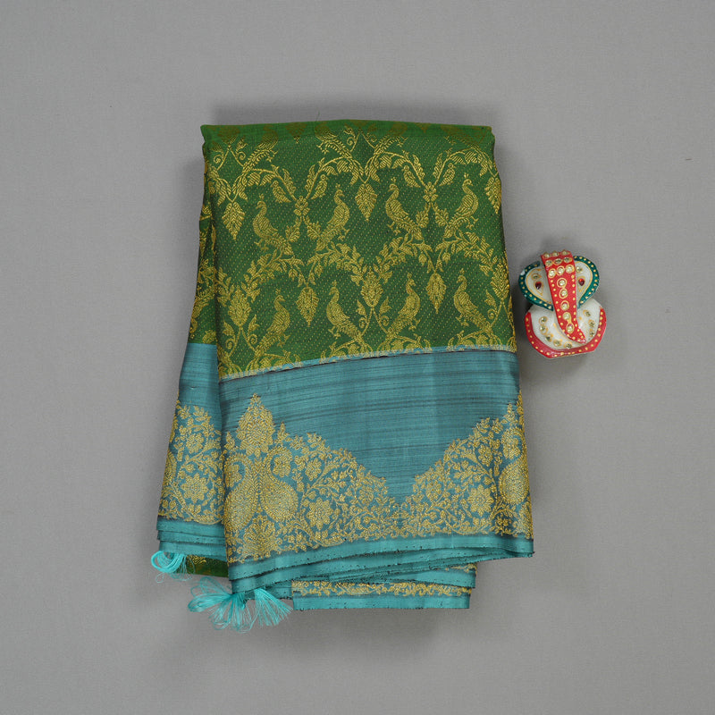 This stunning Kanjeevaram silk saree is a masterpiece of traditional craftsmanship, combining a rich green body with a serene blue border and pallu. The body of the saree is a vibrant bottle green, a classic and elegant color. It is richly adorned with intricate gold zari buttas, featuring a delicate motif of twin parrots perched on a stylized floral and geometric pattern. These buttas are meticulously woven, creating a luxurious and textured feel.