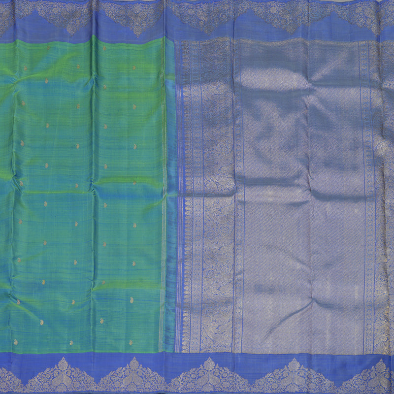 Exude ethereal charm in this mesmerising dual-tone (blue & green) Handloom Kanjivaram silk saree, featuring a body that shimmers with every movement. The design is anchored by a sophisticated turning border, meticulously woven with classic paisley and floral motifs that flow seamlessly into a richly woven pallu.