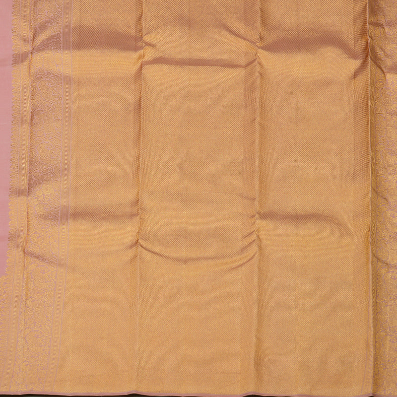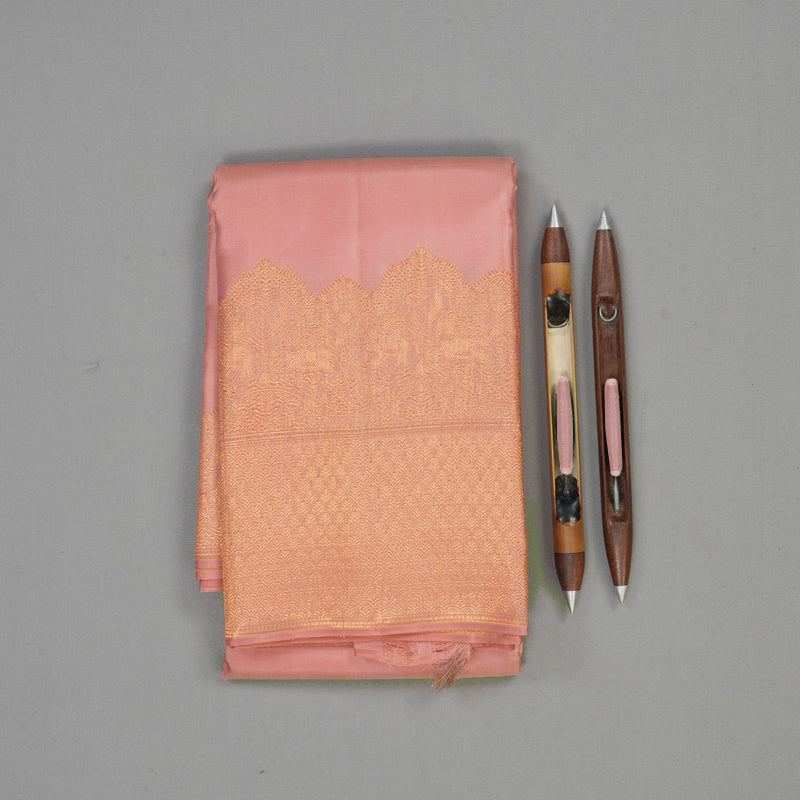 Exude timeless grace with this classic Handloom Kanjivaram Silk Saree in a stunning Rose Pink. This monotoned saree offers a seamless flow of color, creating a sophisticated and elongated silhouette that is perfect for the modern traditionalist.