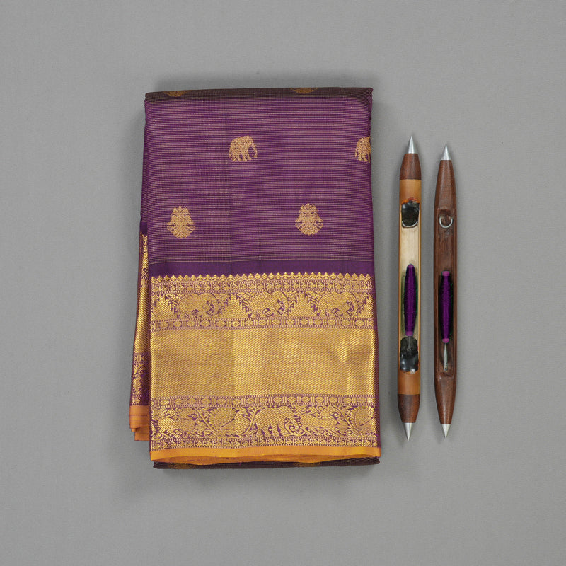 This Kanjivaram silk saree in luxurious deep violet showcases delicate vairaoosi lines paired with graceful elephant and iruthalaipakshi motifs adorning the body. The grand border exemplifies superior weaving mastery, seamlessly blending elephant, temple, and rudraksham elements, framed by a sandal selvedge for authentic traditional character. The densely woven pallu serves as a striking focal point with exceptional artisanal detail.