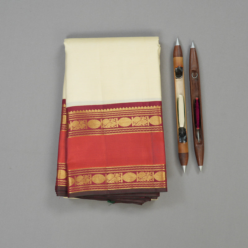 A striking, earthy contrast defines this magnificent Pale Yellow Korvai Contrast Kanjivaram Silk Saree, framed by a deep Rust Orange Border. This pure silk features a traditional Rettapet border woven with majestic annapakshi and rudraksha motifs. The body boasts a Vairaoosi weave for a rich sheen.