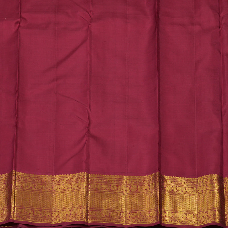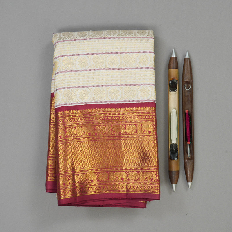 The saree is framed by a majestic border adorned with elephant and peacock motifs, alongside many traditional heritage elements that flow seamlessly into a maroon pallu and blouse. Priced at Rs. 37,810, this masterpiece radiates a timeless bridal glow, making it perfect for muhurthams and special occasions where tradition meets ultimate luxury.