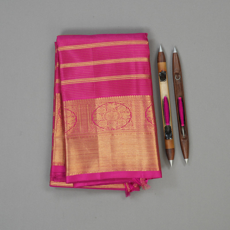Embrace unparalleled opulence in this rani pink Handloom Kanjivaram silk saree, featuring a masterful fusion of traditional veldhari and vairaoosi in shimmering jari. This monotone masterpiece is framed by a grand woven border, exuding a regal and cohesive aesthetic.