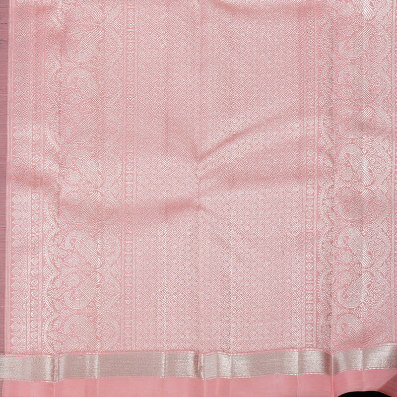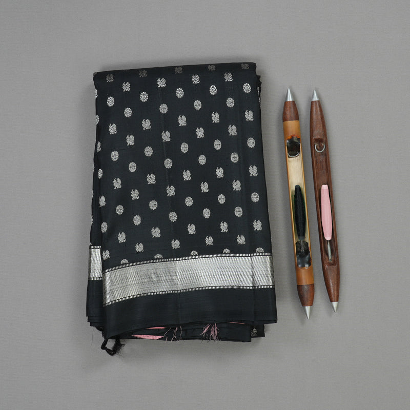 A deep, commanding look defines this classic Black Vintage Kanjivaram Silk Saree. This pure silk heirloom features graceful mayil and chakram motifs on the body.