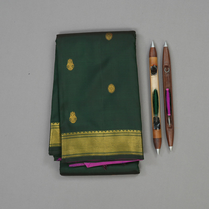 Step out in this exquisite Handloom Kanjivaram Silk Saree, featuring a truly eye grabbing colour combination. The body and border are presented in a stately Bottle green hue, giving the saree a cohesive and majestic base. The body is traditionally adorned with intricate Iruthalaipakshi and chakram motifs, symbolizing power and balance.