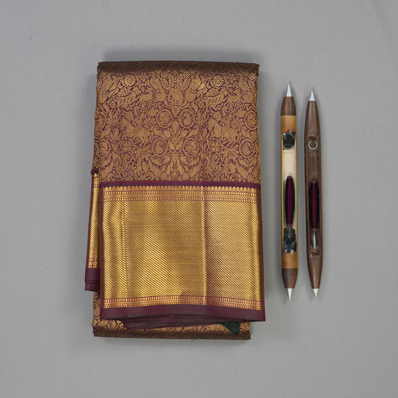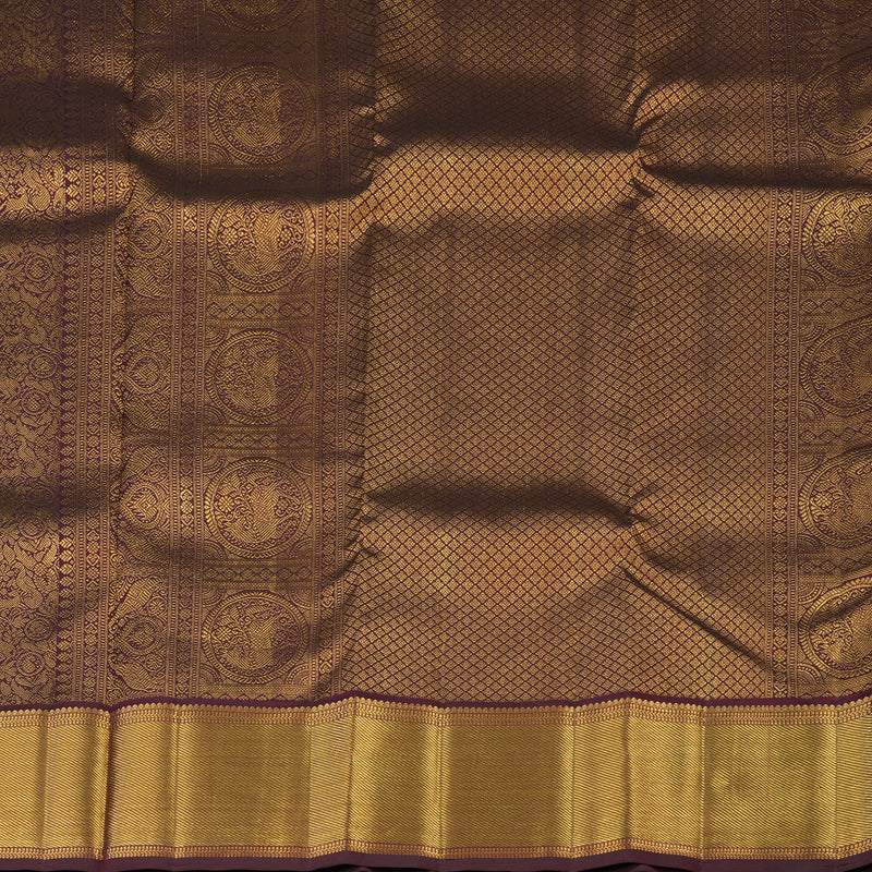 This Handloom Kanjivaram features a regal, deep wine body adorned with the legendary vanasingaram patterns, depicting a rich tapestry of flora and fauna. The design is framed by a lustrous gettipet border, which adds a solid and traditional structure to the intricate weave.