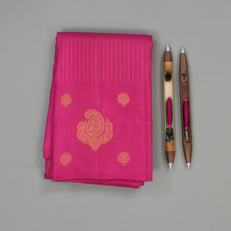 Drape yourself in the vibrant glow of this Vintage Magenta Pink Kanjivaram Silk Saree. The body features subtle, complementary stripes, adding texture, while the border is richly woven with a classic paisley pattern. This is a quintessential, feminine, and celebratory Kanjivaram colour.