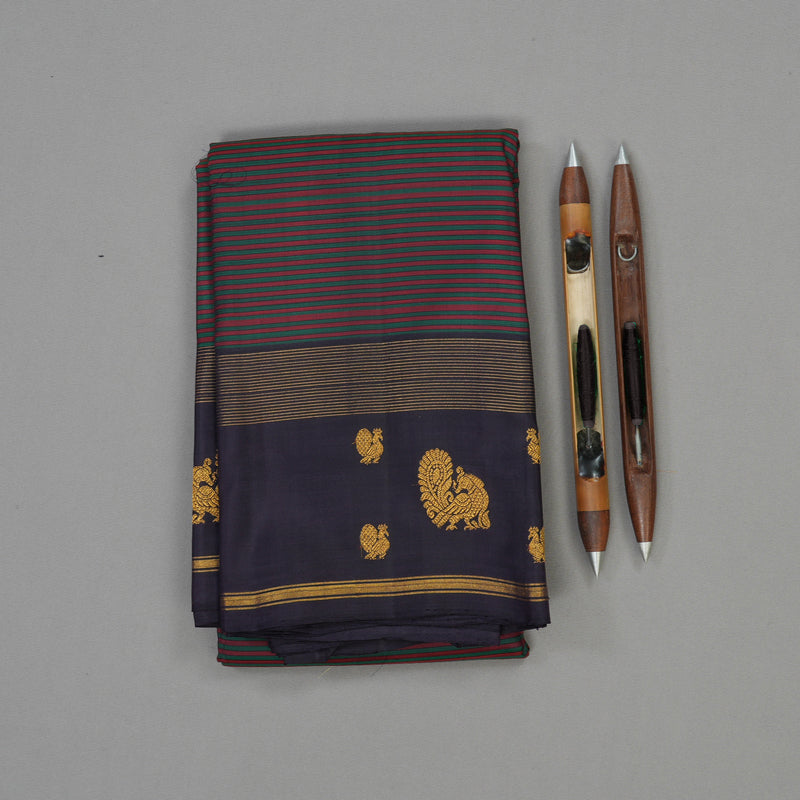 Step out in this unique masterpiece, a stunning Pure Kanjivaram Silk Saree that beautifully blends tradition with modern design. The body features striking maroon and green stripes, creating a dynamic and visually captivating pattern across the drape. This vibrant body is elegantly framed by a deep, rich midnight blue border, pallu, and blouse, providing a dramatic and sophisticated contrast.