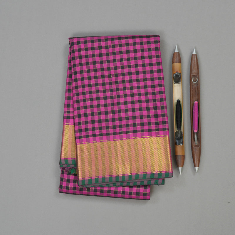 Bold, traditional, and timeless, this vintage-style Kanjivaram silk saree features a striking black base adorned with vibrant pink checks throughout the body, offering a beautiful blend of old-world charm and statement-making appeal.